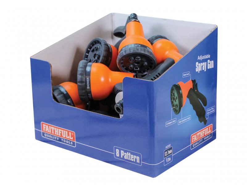 The Faithfull 8 Pattern Adjustable Spray Gun features a plastic body, comfort-grip handle, fitted with a 12.7mm (1/2in) male hose connector. The trigger features an auto-lock to allow hands-free use. It delivers eight patterns: cone, centre, mist, shower, flat, angle, full and soaker, that can be selected by turning the front faceplate.