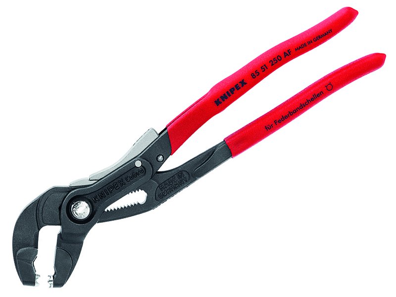 The Knipex 85 51 250 AF Spring Hose Clamp Pliers have a locking device that enables simple and secure work on clamps under tension without effort and has a one-hand release.