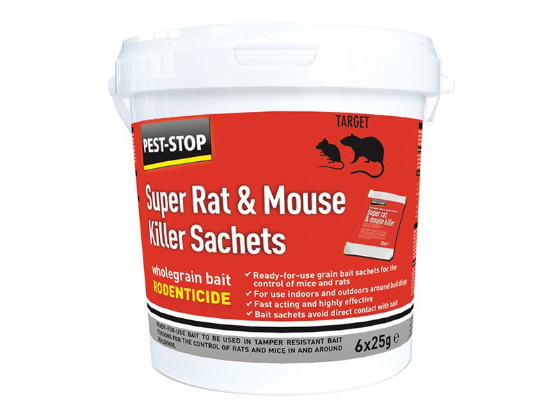 Pest-Stop Super Rat & Mouse Killer Sachets are ready to use, no need to open or touch the bait. Contains difenacoum (legally compliant 25ppm). It has an aniseed scent, highly attractive to rodents. Packed into plastic tubs for freshness and security. Recommended for use with bait station. Directions for use included.