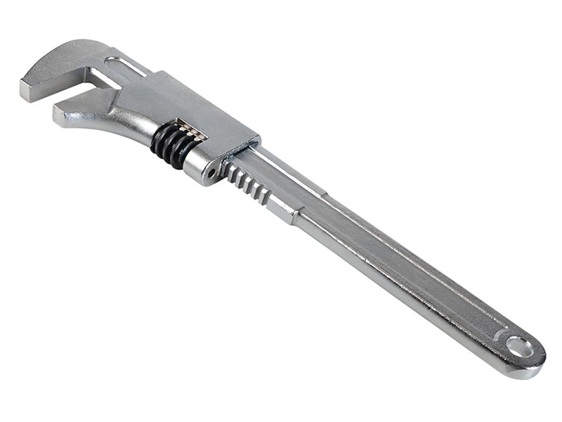 Traditional design engineers adjustable wrench with corrosion resistant black finish. Adjustment is via a thumbscrew on the handle.